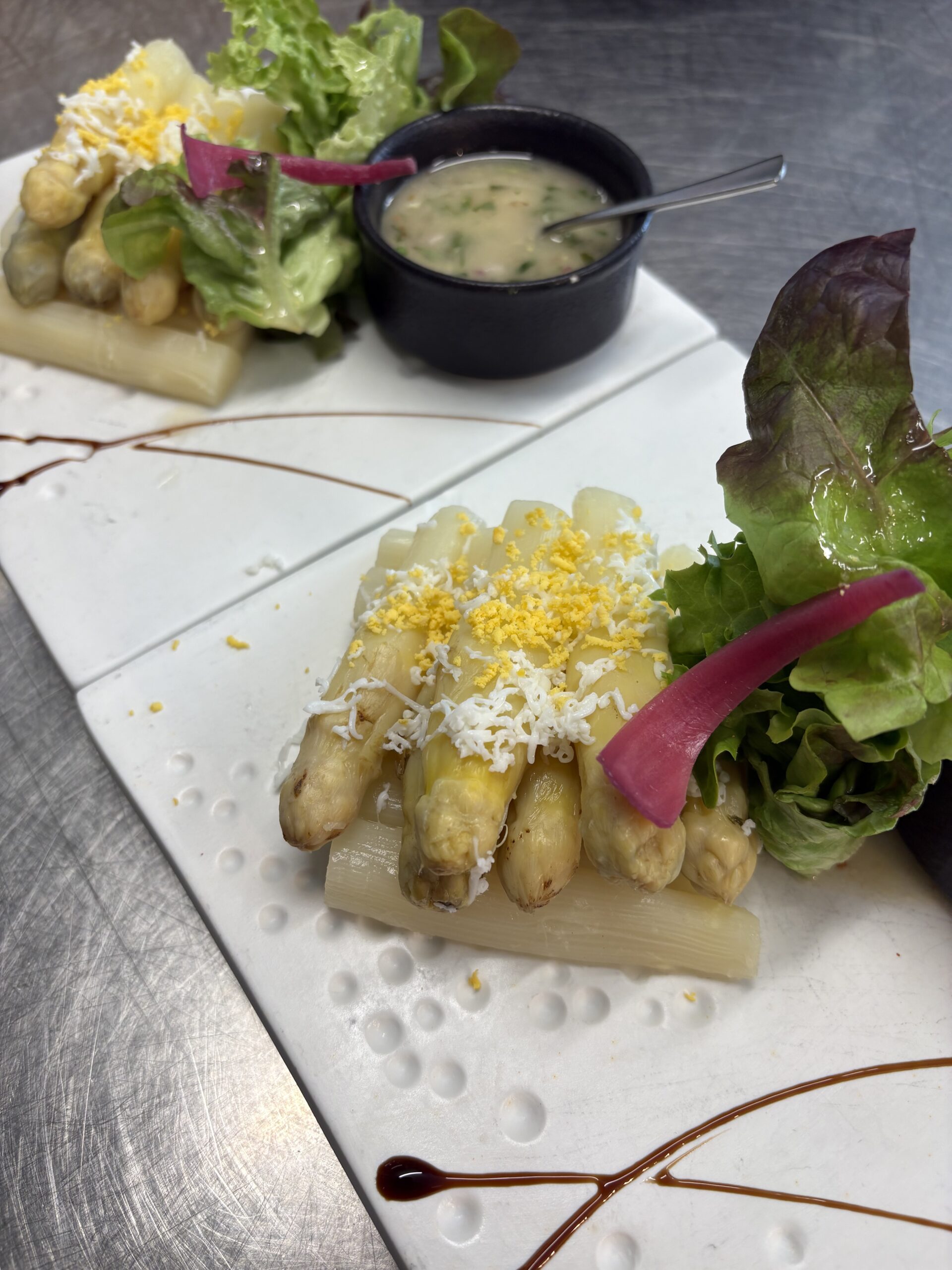 Cordon de balsamique réduit et bouquet de salade